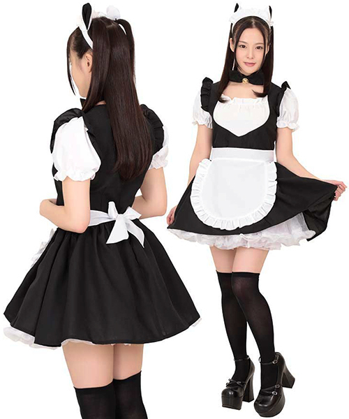 黒×白のミニワンピは胸元ギャザーでセクシーに!かわゆい猫耳カチューシャとチョーカーが萌え〜なコスプレ衣装で、ご主人様にご奉仕するニャン!