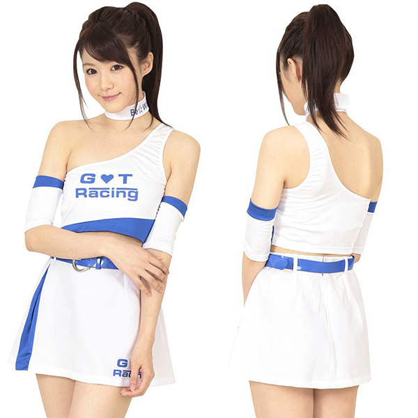 白に青のポイントカラーが爽やかな、レースクイーン衣装!ピッタリと胸元にフィットするトップスは、セクシーさを忘れないワンショルダーデザイン!わき腹、おヘソを露出するセパレートタイプになっていて、ミニ丈スカートにもこだわりの青を挿し色に。