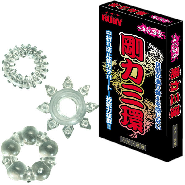 全体がツブツブしたものや刺激度満点な突起状のものなど、個性豊かな3種類がセット!ひとつずつ日替わりで楽しんだり、根元とカリへ重ねづけしたりと楽しみ方はアナタ次第。