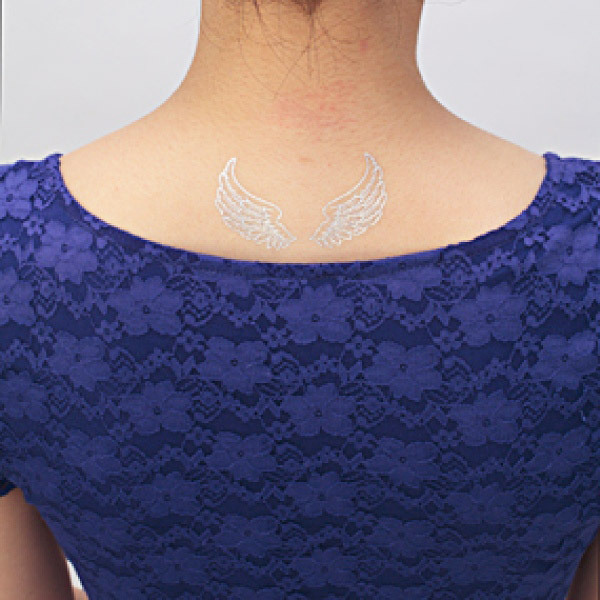 彫師デザインによる銀色に輝く天使の羽根は、今にも羽ばたきそうなリアル感。