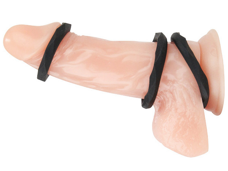 スタイリッシュなカッティング加工を施した、ブラックシリコンの男性用コックリング3個セット。