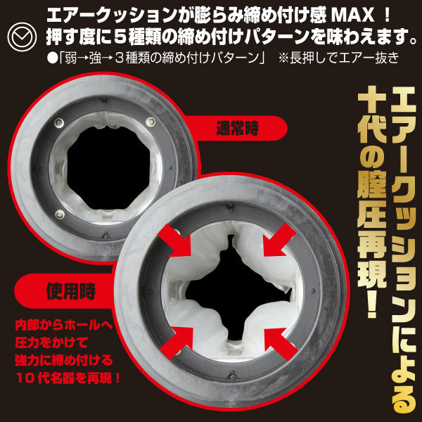 エアークッションのリアルな締め付け感と、内蔵ローターの快感に驚く暇もなく速射する!?一度使うと手離せなくなる電動グッズです。