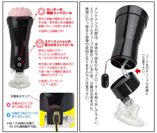 ●5種類の圧縮モードでリアルな膣圧をコントロール(下ボタン)●8種類のパワフル振動切替え(上ボタン)●下ボタン長押し→エアー抜き●しっかり固定できる強力吸盤付き●便利なUSB充電・約1時間半の充電で45分間の連続稼働●充電中→赤ランプ点滅・完了→青ランプ点灯●オナホール:もっちり柔らか素材・ヒダ→イボ→突起構造●本体から取り外して洗浄すれば繰り返し使用OK。