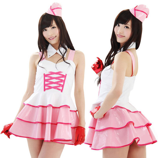 編上げやパイピングに濃い色を使ってメリハリを効かせた、エナメル調のセクシーコスチュームです。