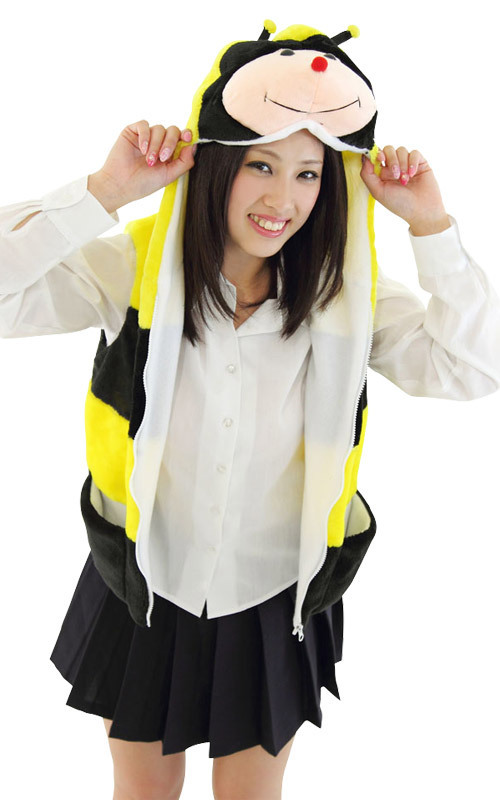 ●大人用フリーサイズ●黄×黒のしましまデザイン●肌触りの良いふわふわ素材●フロントファスナーで開閉可●赤鼻がキュートなみつばちのフード●左右ポケット付き。
