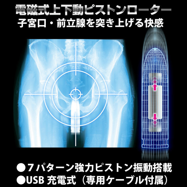 ●弾丸フォルムのシングルタイプ●メタリックなきらめきボディ●電磁石による反発力でピストン●ワンボタンの簡単アクション●電源…ON/OFFともに3秒長押し●振動…押すごとに7種切替(ループ)●専用ケーブルによるUSB充電式●フル充電(90分)で約1時間稼働●充電完了は一目瞭然(赤→青)。