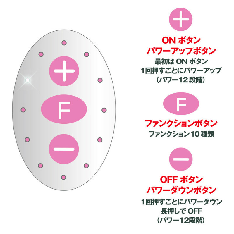 ●先端がクイッと曲がった鉤爪型●最高14000回転の超ハイパワー●12種類の強弱切り替え(+-ボタン)●10種類のリズム切り替え(Fボタン)●12×10=120種のアクションに●周囲を気にせず使える静音設計●お手入れ簡単な生活防水機能。
