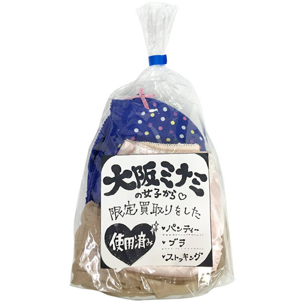 ●ミナミ(大阪の繁華街)女子限定●リアル感満載の使用済み系下着●ブラジャー×1・パンティ×1・ストッキング×1の3点セット●中身が見える透明パッケージ入り。