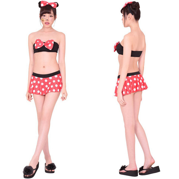 ●上下セパレートのビキニタイプ●赤・白・黒のビビッドな色使い●黒いチューブブラ×胸元リボン●ドット柄のスカート付きパンツ●お揃いリボンのカチューシャ付●実際に入水することも可能。