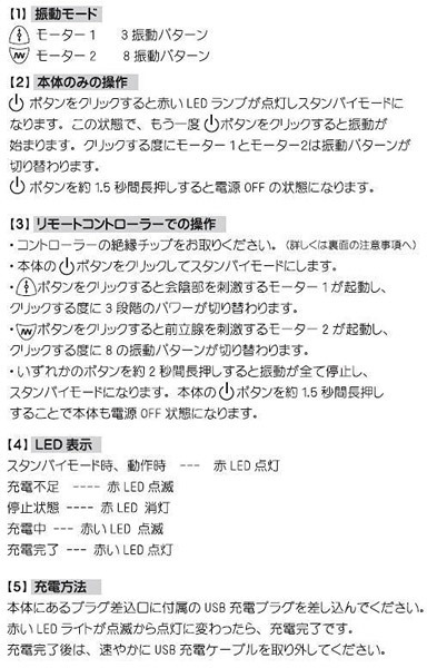 ●「LEVETT Funmates」シリーズ・Neroバージョン●上質なシリコン素材を採用●衛生的に使える生活防水仕様●本体→USB充電式・リモコン→ボタン電池(CR2032)●フル充電3時間で最大1.5時間稼働●リモコン操作はもちろん、本体のみの操作も可能●モーター1(会陰部)=3つの振動●モーター2(前立腺部)=8つの振動●いずれかのボタンを約2秒間押すと振動停止(待機モード)●本体のボタンを約1.5秒押すと電源OFF。