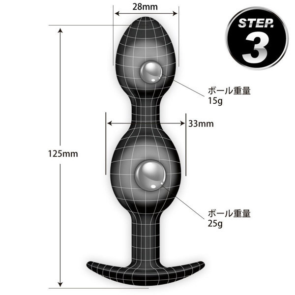 ●全長12.5cm×最大径3.3φcm●大小2連団子型の「STEP3」●ストッパー付きのプラグ形状●安心安全な高品質シリコン素材●メタルボール2個(小15g・大25g)を内蔵●自在に動いて存在感をアピール。