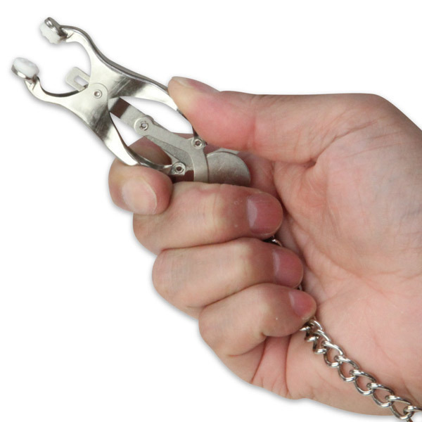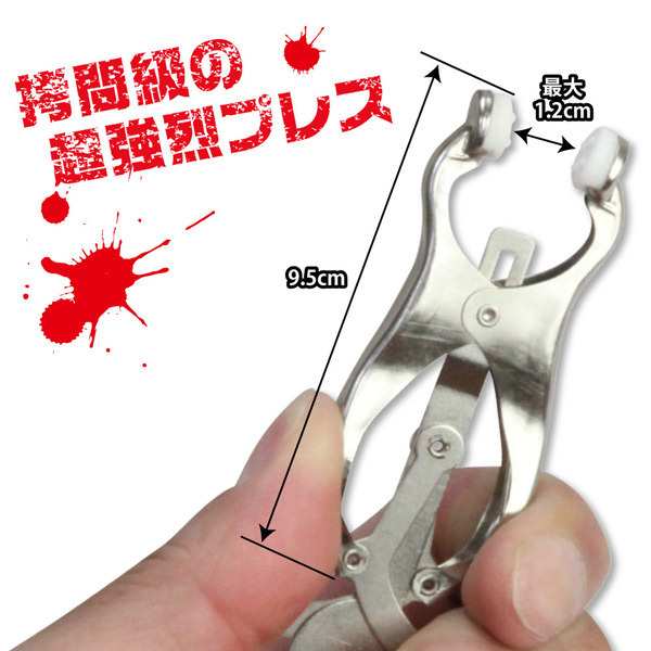 超ハードプレイを楽しめるSMグッズ!プレス刺激に加え、2つのクリップを繋ぐチェーンの重みによる負荷で痛気持ち良さも増幅!クリップの開閉幅は最大1.2cmです。