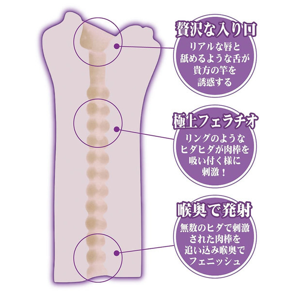 入り口からリアルな唇と舐めるような舌がアナタの竿を誘惑!続いてリングのようなヒダヒダが肉棒に吸い付くように刺激します。