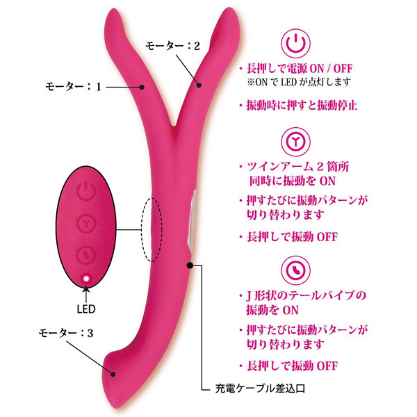 二股のアームで乳首やクリをピンポイントで挟み込み!また、J型に絶妙なカーブを描く逆側のテールバイブはGスポットを確実に捉え、芯まで響くアクメ必至の強力刺激をもたらします。