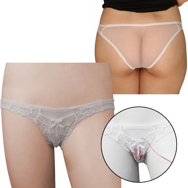 透け感のあるフローラルレースのフロントにお手持ちのローターを収納できるポケット付きランジェリー!後姿はセクシーなホワイトシースルーのフルバックタイプです。