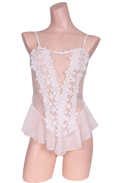 フロントに花柄モチーフをVラインにあしらい、裾のシフォンフリルでウエストのくびれを強調!ベースは模様入りストレッチネットだからフィット感抜群のベビードールとTバックの豪華セット。