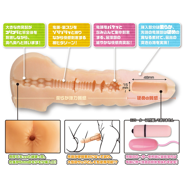 お尻の穴の先はサオをゴリっと刺激するイボゾーンや、亀頭と裏筋にゾリゾリ刺激を加える横ヒダ空間、亀頭を咥え込み集中刺激する肉突起ゾーンを配置し、緩やかな快感でフィニッシュまで導きます♪先端部にはローターを装着することも出来るため、市販のローターをプラスして亀頭へ快感振動を与えることも可能!1つで多様な楽しみ方をしていただけるホールとなっています♪ローション付属