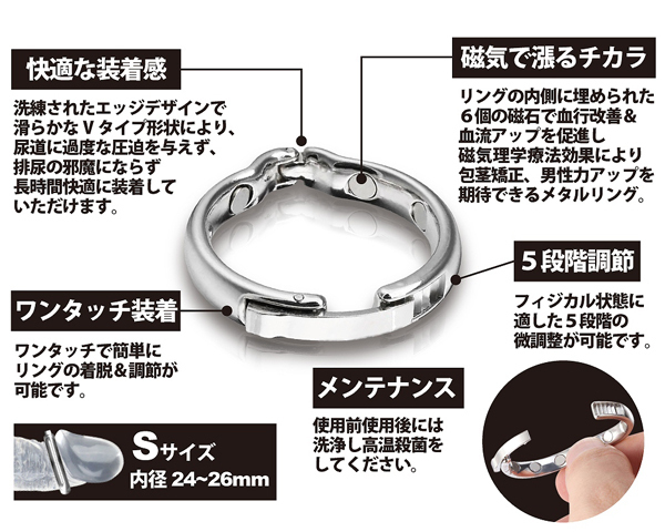 包茎や持続力など男性特有の悩みをサポートする男性補助アイテムならコチラ!内径およそ2.4cm〜2.6cm、洗練された美しいデザインでありながら磁石のパワーで血行を促したり包皮をまとめるなど、男性の自信を取り戻すべくしっかりと働いてくれるのがこのペニス増強グッズ。