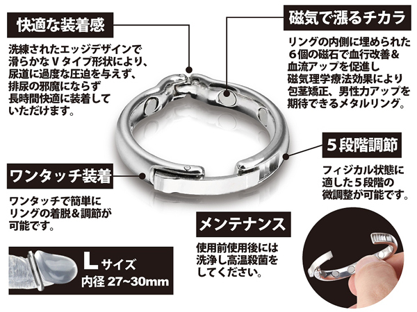 リングの内側に埋め込まれた6つの磁石が血流UPを促進、男性の象徴を力漲る猛々しい股間へ導けるようにサポート!デザインにも優れたメタル製のリングは尿道を圧迫しないため排尿の邪魔にもならず、長時間の装着でも快適にお使いいただけるペニス増強グッズです♪使用後のメンテナンスは、水洗いをして煮沸消毒にて殺菌消毒をおこなってください。