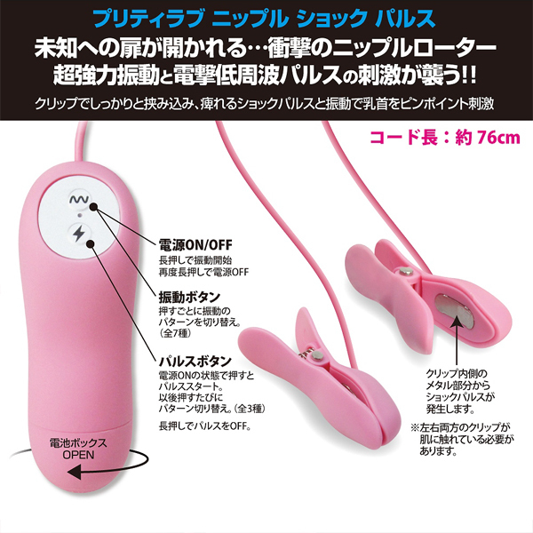 乳首を挟み込み、超強力振動と電撃低周波パルスの刺激が襲うニップルローター!!電気刺激でビクンビクン収縮させつつ、強烈な振動で乳首をピンポイントで責めまくります。