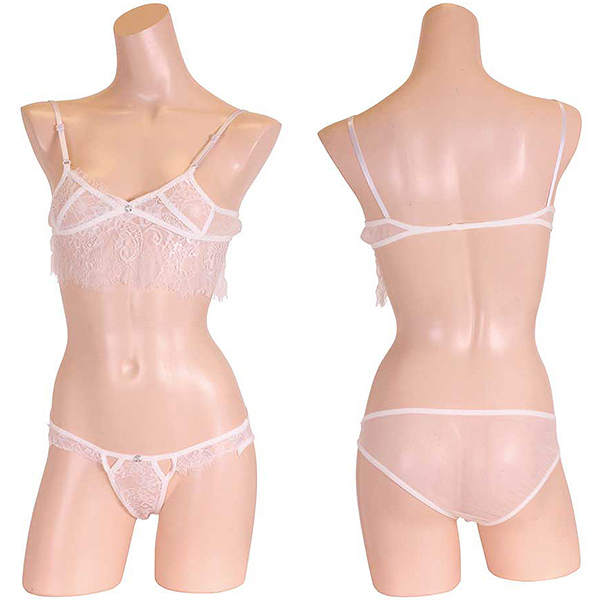 繊細に編み込まれた純白レースとキラキラストーンが女性を輝かせるブラ&ショーツ!極薄パワーネットで透明感を出しつつ、タイトなフィット感で快適な着心地も追求したセクシーランジェリー。