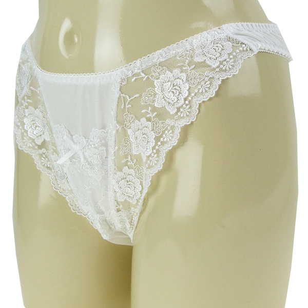 艶やかな光沢が美しいフェリカ生地と繊細なレース生地を組み合わせた日本製Tバック(白)。