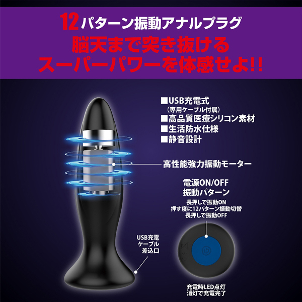 高品質な医療用の滑らかなシリコン素材を採用でお尻にスルッと挿入しやすい♪肛門に装着後は1つのボタンを押すだけで、電源のオンオフから12種類もの多彩な振動パターンを操作可能!脳天を貫くようななパワフル刺激で快感体験♪生活防水&静音設計