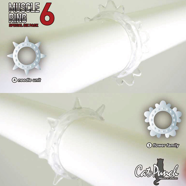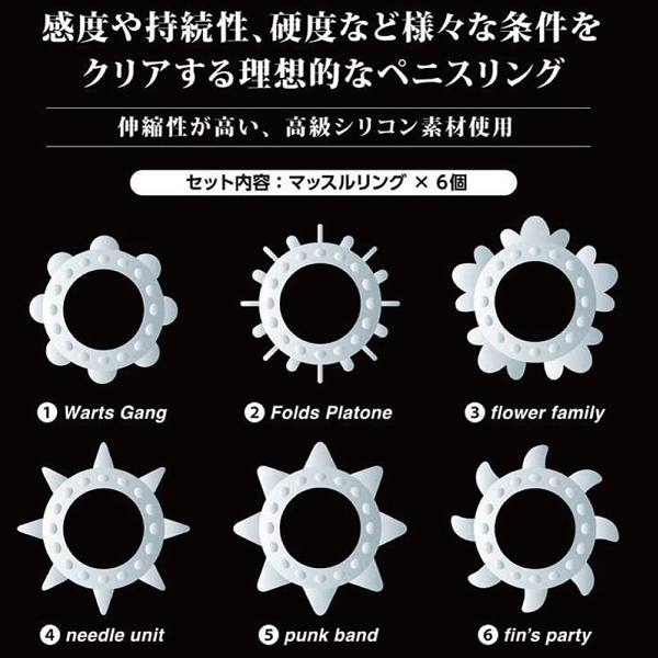 6つの個性豊かな形状が楽しめる高級シリコン素材のペニスリング。