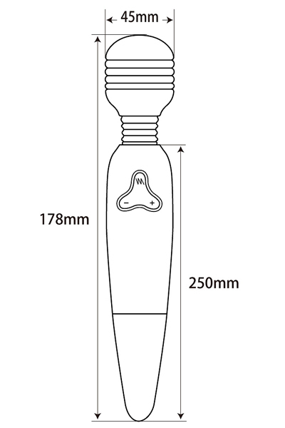 パッケージ:29.0×6.0×5.0cm 本体:全長25.0cm・ヘッド直径4.5cm USB充電式