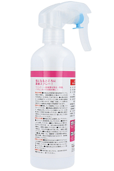 ウイルスや細菌の除去&除菌ほか、嫌な臭いもこれ一本♪気になる場所へシュッと一吹きするだけ簡単衛生管理!ご家庭や医療、教育、介護現場など毎日の予防に◎安定型次亜塩素酸ナトリウムを純水で希釈した濃度調整済の除菌消臭スプレー。