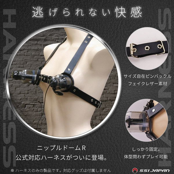 柔らかな合皮素材の黒ハーネスがニップルドームを胸にしっかり固定!サイズ調整できるピンバックル式で、男女、体型問わず幅広いプレイを可能にします。