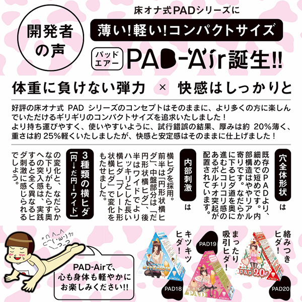 「体重に負けない弾力×快感はしっかりと」好評の床オナ式PADシリーズのコンセプトはそのままに、より多くの方に楽しんでいただけるギリギリのコンパクトサイズを追求いたしました!内部構造はややリアル寄りです。