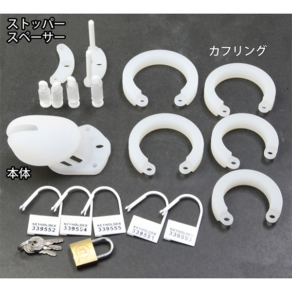 セット内容:本体、カフリング×5、リング固定パーツ、スペーサー×4、ストッパー棒×4、南京錠、プラスチックキー×5、日本語説明書