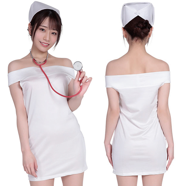 こんなナースになら是非看護してほしい♪プライベートでコスプレを楽しむときに着たくなるオフショルダーラップ風なワンピースデザインのナースコスチュームです。
