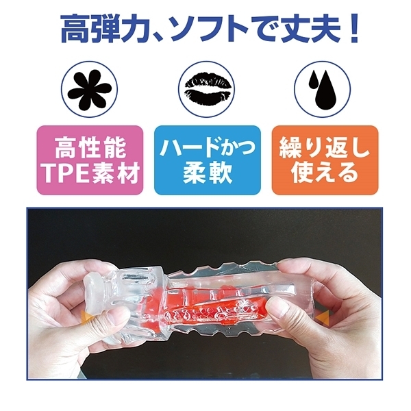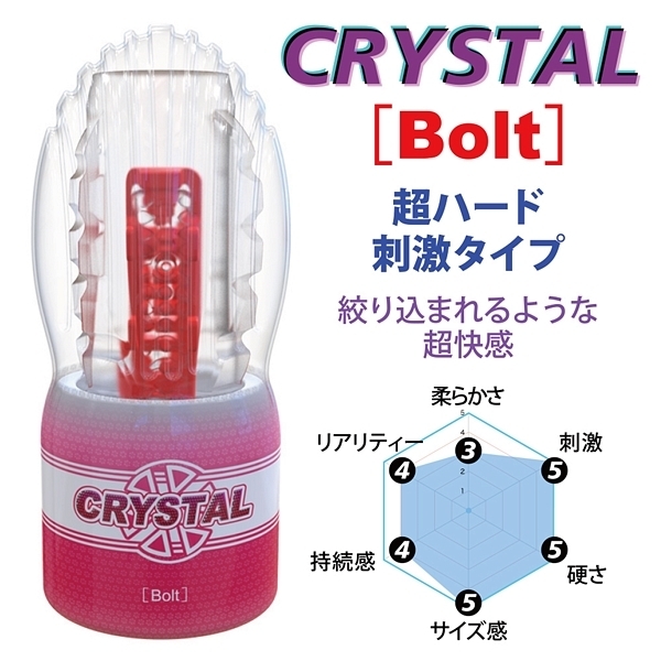 挿入直後からクリップされるように迫りだすコブとブロックのようなヒダの刺激がたまらない!2構造のインナーホールにソフトゲルが包み込むハードな内部構造体が刺激的な非貫通オナホ「CRYSTAL」。