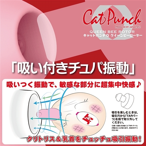 クリトリスに吸い付いてチュパチュパ振動するキャットパンチシリーズから新感覚のクリ刺激型吸引ローターが登場!あの人気の「吸引バイブ」が超進化♪吸引穴にセットした「TAPパーツ(付属)」が、クリトリスをクリック連打し、吸引モードとノッキングモードでクリを徹底的に刺激します!1人でもカップルでも楽しみ方はイロイロ。