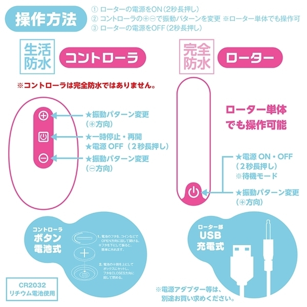 振動機能はリモコン式でボタン電池CR2032が1枚(動作確認用)付属。