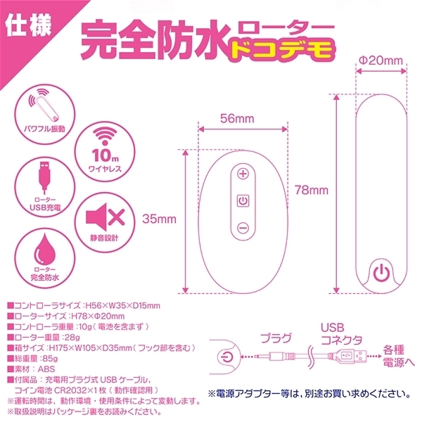 パッケージ:17.5×10.5×3.5cm 本体:ローター7.8×2.0cm・コントローラー5.6×3.5×1.5cm 電池:本体(USB充電式)、リモコン(ボタン電池CR2032)
