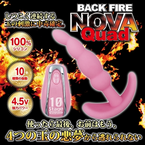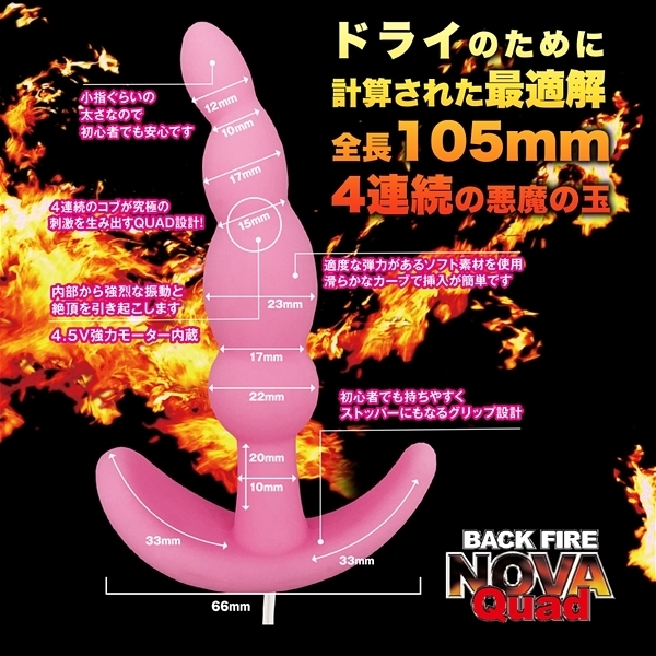 人気のバックファイアシリーズから「バックファイアーNOVA QUAD」が登場しました♪クワッドは座薬の位の大きさの1センチの先端から始まり、指のような緩やかなカーブで1.6センチ、2.2センチ、2.1センチの大きさのコブが続く形状となっています!全部で4連続の(クワッド)の隆起が続く設計で、内部に密着しながらゆるやかなカーブが前立線やGスポットなどをダイレクトに刺激してくれます♪奥まで入れると入り口付近で強烈な振動と快感を引き起こすスタイル!未知なる衝撃と快感をぜひお試し下さい♪カラーバリエーションはブラックとピンクの2色展開でこちらはピンクとなります。