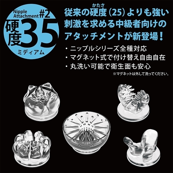 個性あふれる5種のアタッチメントを、両乳首に使えるよう、すべて2個ずつご用意。