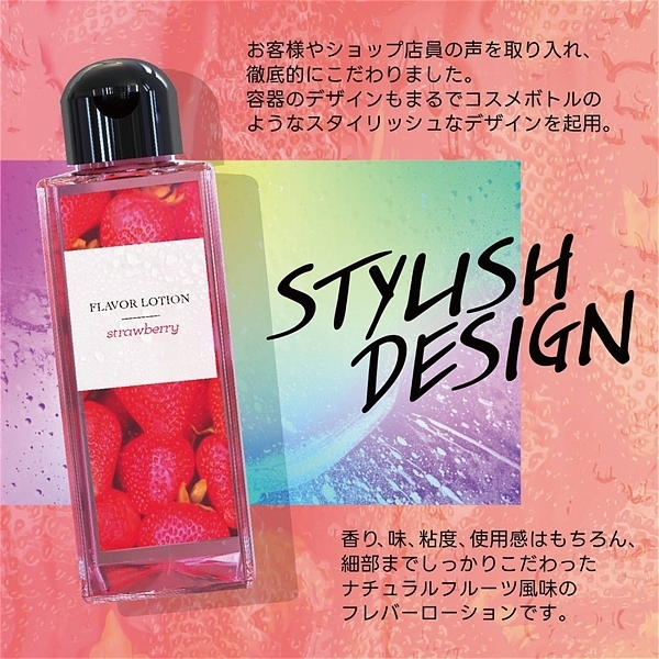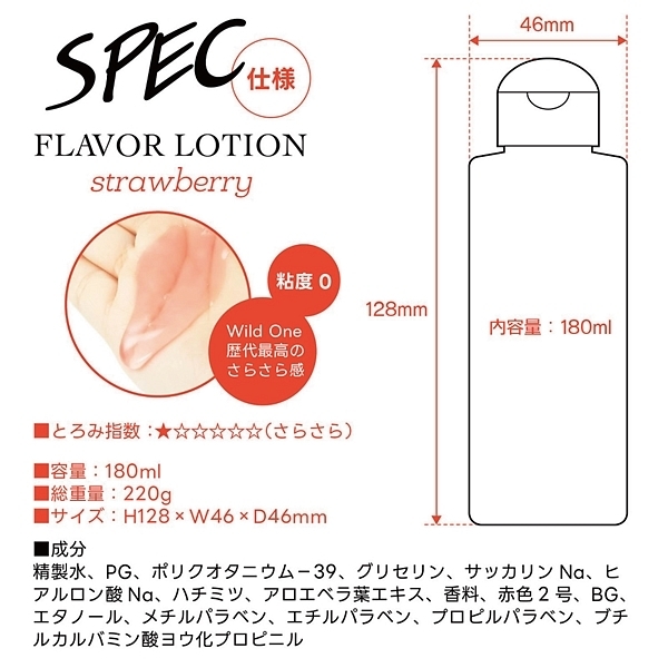 フルーティーな味と香りで新感覚プレイ!ワイルドワン女子が企画・開発した女性のためのフレバーローション!安心安全の国内素材で水のように「超さらさら」、フルーツみたいに美味しい水溶性ローションです!<成分>精製水、PG、ポリクオタニウム-39、グリセリン、サッカリンNa、ヒアルロン酸Na、ハチミツ、アロエベラ葉エキス、香料、赤色2号、BG、エタノール、メチルパラベン、エチルパラベン、プロピルパラベン、ブチルカルバミン酸ヨウ化プロビニル。