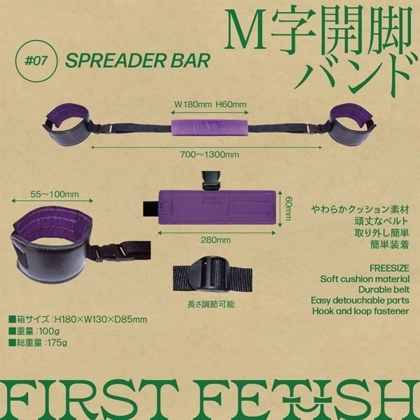 パッケージ:18.0×13.0×8.5cm 本体:連結ベルト70.0〜130.0cm・足枷(6.0×28.0cm・内径5.5〜10.0cm)