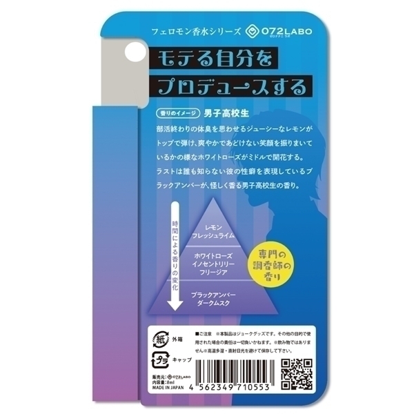 ●男子高校生:部活終わりの体臭を思わせるジューシーなレモンがトップで弾け、爽やかであどけない笑顔を振りまいているかの様なホワイトローズがミドルで開花する。