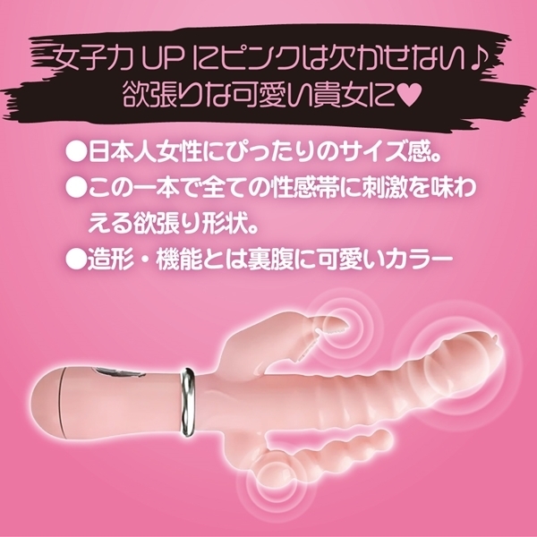 えっちにももちろんカワイイは欠かせない!そんな欲張りで可愛いあなたに、柔らかくて身体にフィットするカワイイピンクカラーのバイブが新登場!可愛い色と侮るなかれ!その形状は、C(Clitoris)P(Portio)G(G−spot)A(Anal)の4か所を同時に刺激する超強欲形状!12パターンの強力振動が全体に伝わり、4か所一気に快感刺激♪