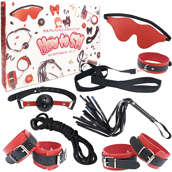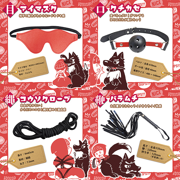 パッケージ:17.0×26.0×7.0cm 本体:@アイマスク(マスク部分8.5×20.5cm、フリーサイズ、素材:ゴムひも)、A口枷(ベルト全長61.0cm・ボール直径4.0cm・着用サイズ40.0〜54.0cm)B手枷(ベルト全長30.0cm・幅4.0cm・チェーン9.0cm・着用サイズ11.0〜21.0cm)C足枷(ベルト(全長34.5cm・ベルト幅4.0cm・チェーン9.0cm・着用サイズ17.0〜27.0cm)Dリード付き首輪(ベルト全長50.0cm・ベルト幅4.0cm・着用サイズ32.0〜40.0cm・リード100cm)E拘束ロープ(長さ4m65cm・太さ0.75cm・素材:組紐)Fバラ鞭(全長53.0cm・鞭32.0cm・持ち手12.0cm)