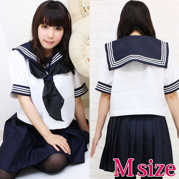 スタンダードなデザインの白×紺の上下に、スカーフもセット!一式揃ったセーラー服のコスプレ衣装です。