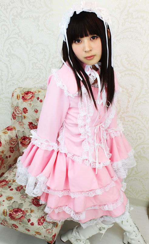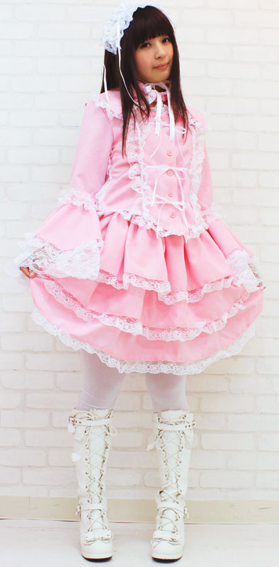 セット内容:上着(前ボタン)・スカート(ウエスト部分ゴム、スカート3枚仕立て、裏地付き、チュールパニエ付き)・付け衿(ボタンにて着脱可)・ヘッドドレス