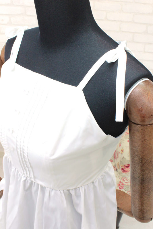 ピンタックやレース、背面のシャーリングなどで、お嬢様風にデコレートしたワンピースです。