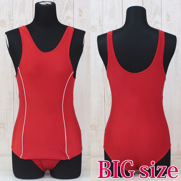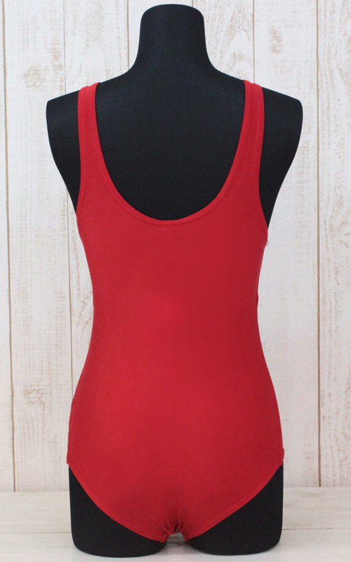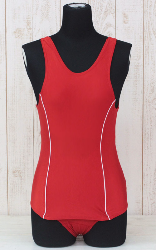 シンプルなデザインに鮮やかな赤がマッチング!伸縮性があるので着やすさも着心地もバツグンな水着コスチュームです。