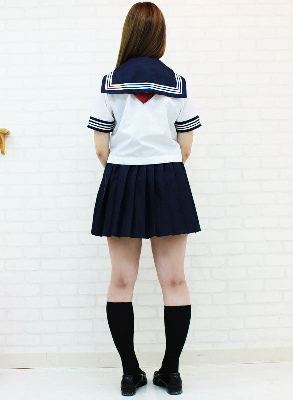 プリーツスカートは総ゴム入りでウエスト楽々!暑い夏も涼しく過ごせる白系トップスに、後ろ襟から少し覗かせたエンジの三角スカーフの3点セットは、可愛い女装にもぴったりな制服コスチュームです。